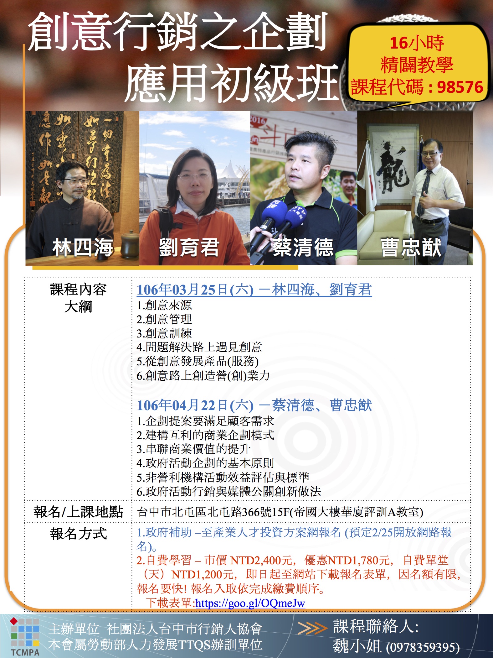 將創意行銷應用結合商務的運用,從創意的形成進階到創意商務企劃應用,包含創意構思與形成、創意產品(服務)、營(創)業力的問題解決、商業企劃模式與商業價值、政府活動企劃、活動行銷與媒體公關創新做法,以系統性的基礎概念,讓學員可以更清楚了解創意在商務企劃應用的價值性與效益性,結合產業觀點提高學員職場行銷競爭力的需求。透過創意方法思考產品(服務)、創業延伸,發展商業、公部門等企劃提案創新創意的練習,強化實務應用能力。
